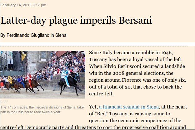 Qualche giorno fa un giornalista del Financial Times di Londra, Ferdinando, ci ha contattato per saperne di più sul nostro MoVimento. Ha partecipato anche ad uno dei nostri appuntamenti “Incontra il Candidato”, prendendo appunti e cercando di capire anche cosa stava succedendo a Siena, città sconvolta dai recenti fatti di cronaca finanziaria inerenti la Banca MPS e relativa Fondazione.