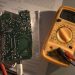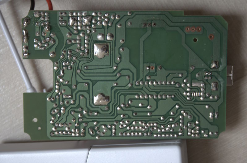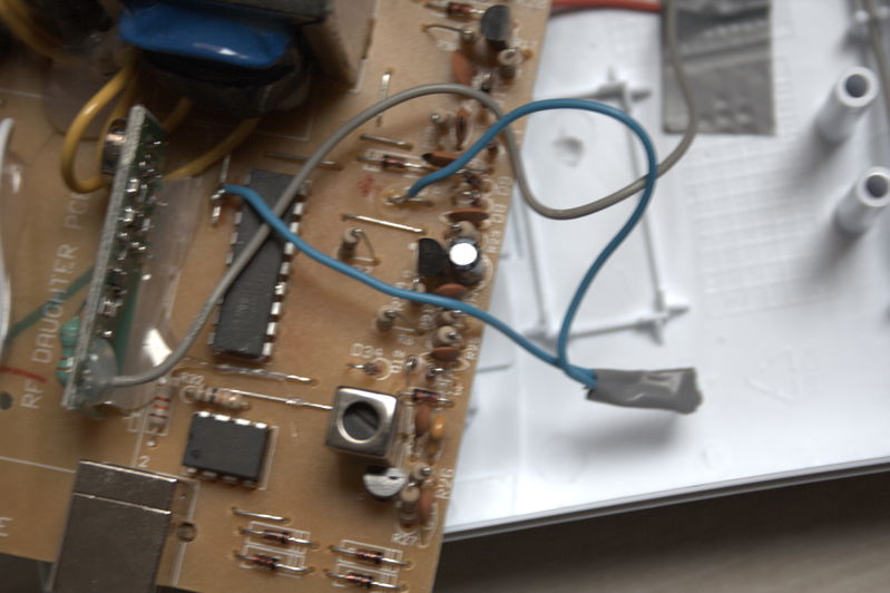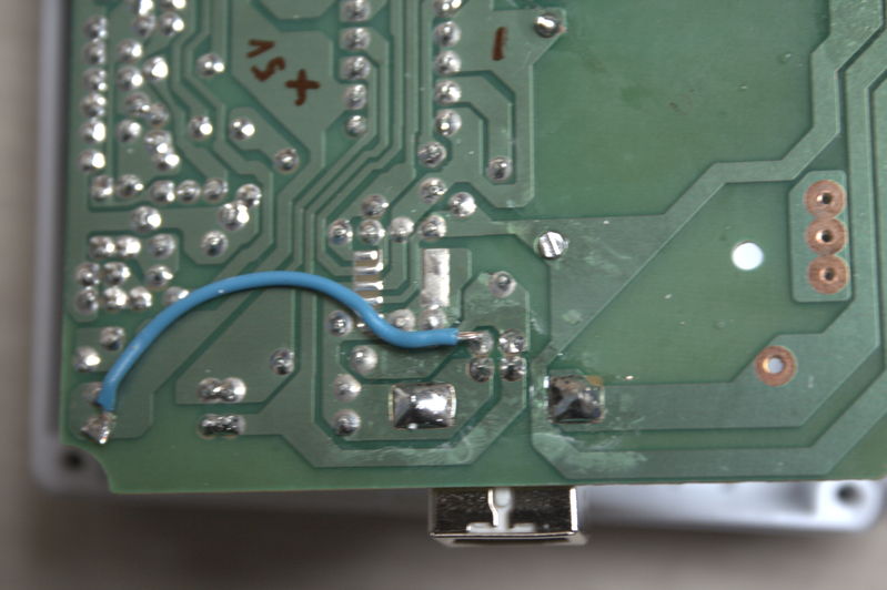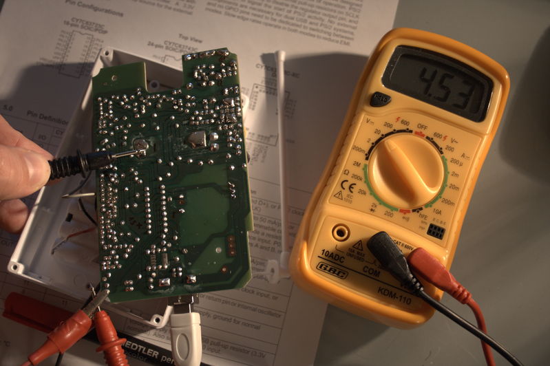 Si nota subito il trasformatore per la 110v, i moduli RF ed il microprocessore (il chip con l’etichetta bianca sopra) che gestisce il tutto, un Cypress CY7C63723-PC. Dal datasheet di tale microcontrollore si scopre che l’alimentazione, 5V, è sui piedini 6 (Vss-GND) ed 11 (Vcc). Una rapida occhiata permette di scoprire che il microcontrollore viene alimentato tramite il circuito di alimentazione composto dal trasformatorino ed altri componenti discreti. Siccome non posso usare la rete elettrica, si tratta di far alimentare il tutto dalla presa USB (che, ricordiamolo,è a 5V e corrente massima di 500mA). Collego il CM15A alla presa USB del PC e con l’aiuto di un multimetro individuo i piedini di alimentazione sul connettore USB presente sulla PCB. A questo punto si tratta di mettere un filo tra tale piedino ed il Vcc del microcontrollore: