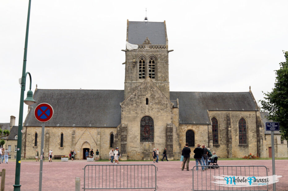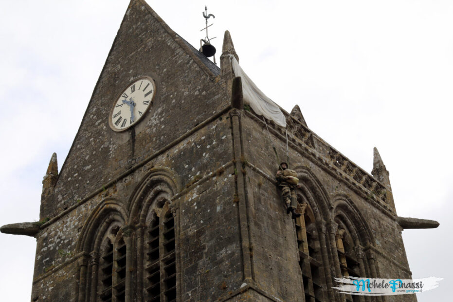 Ci dirigiamo verso Sainte-Mère-Église, distante poco più di 10 km. E’ un tipico e grazioso piccolo borgo, famoso soprattutto per la curiosa vicenda del paracadutista appeso. Per la cronaca, al campanile della chiesa è ancora appeso un manichino e relativo paracadute.