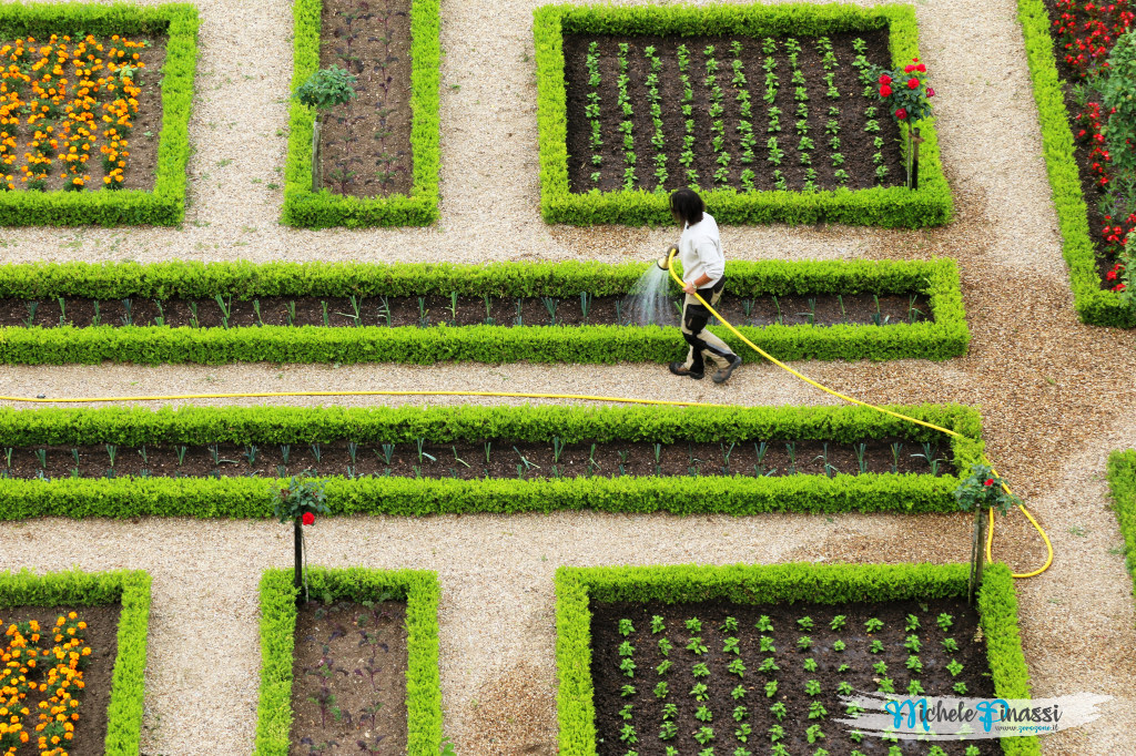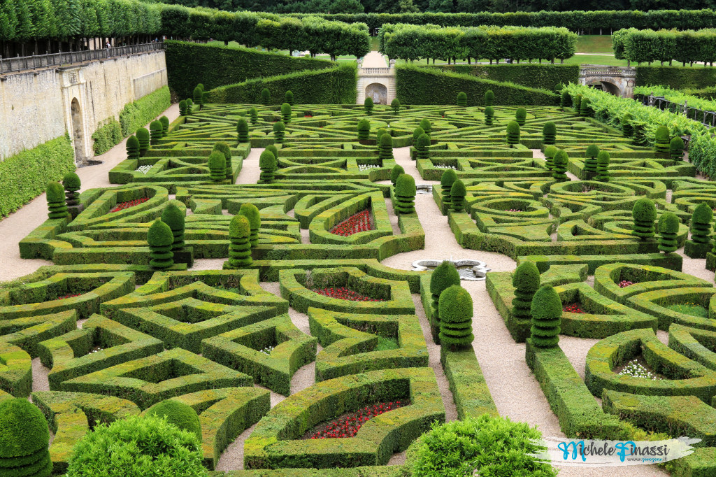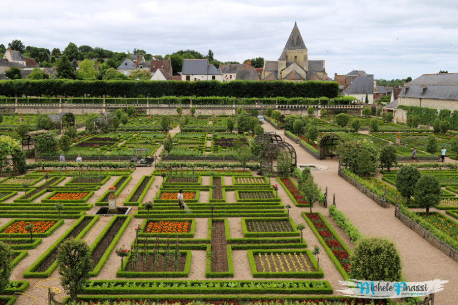 Il clima a Villandry non è più quello fresco della Normandia: le temperature, qui nella Francia continentale, sono già alte di prima mattina. La vicinanza con il fiume Loira contribuisce probabilmente all’umidità, decisamente alta. Ci incamminiamo di buon’ora verso l’ingresso dello Château de Villandry, ancora non preso d’assalto dalle gite turistiche, iniziando la visita dai bellissimi e curatissimi giardini e fontane.