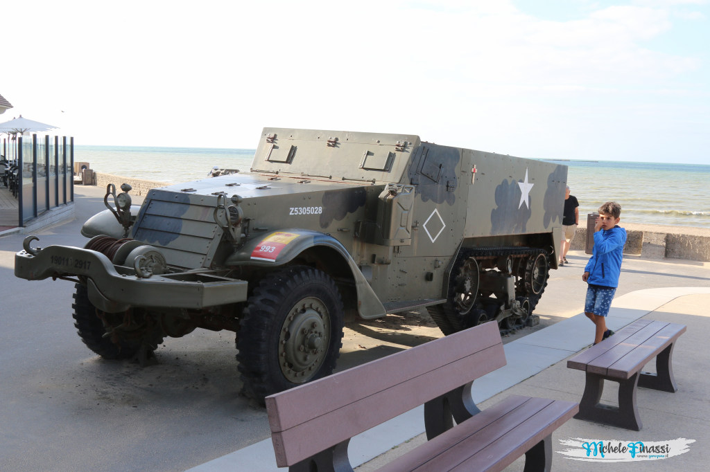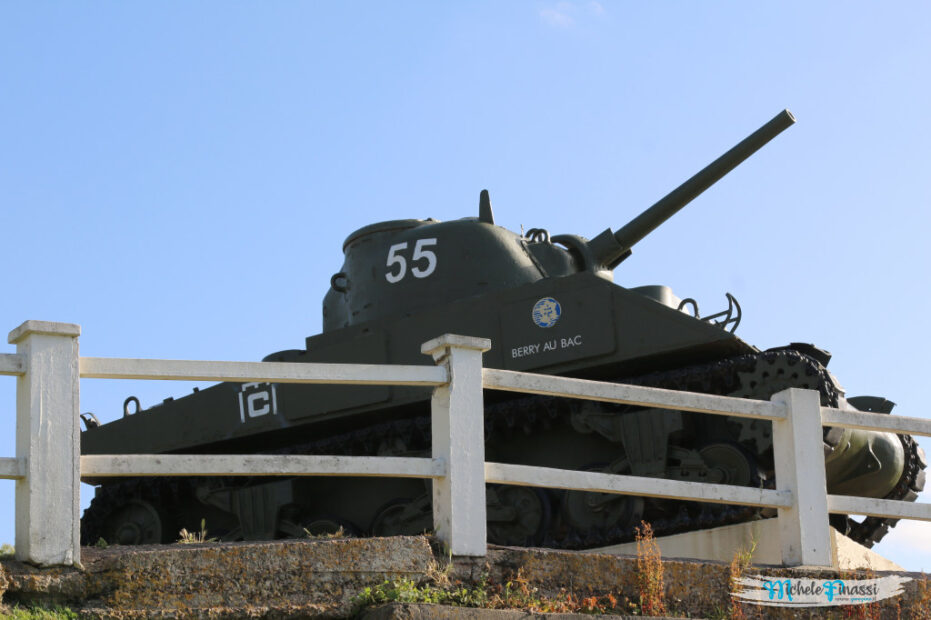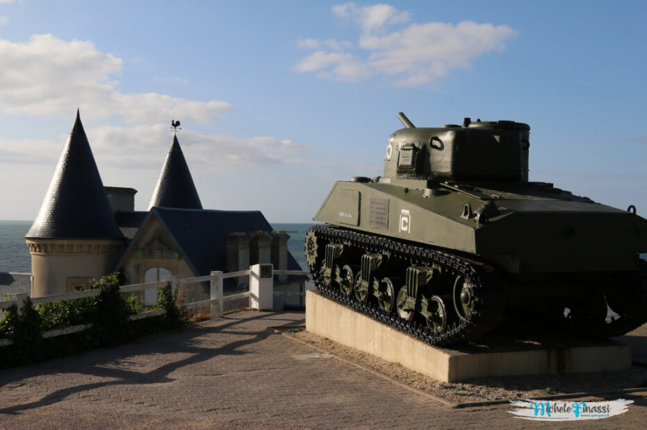 Arromanches ci accoglie pochi km dopo con una bella area di sosta proprio sulla scogliera accanto al piccolo borgo, accanto al Museo “Arromanches 360°“, un cinema circolare che mostra i filmati dello sbarco. Il cinema ormai è chiuso ma il luogo è bellissimo e il panorama davvero stupendo. Facciamo 4 passi nel piccolo borgo sul mare, dove ad accoglierci c’è un carro armato Sherman, che presidia il mare: anche se son passati ormai quasi 80 anni da quei terribili momenti, sembra quasi di riviverli.