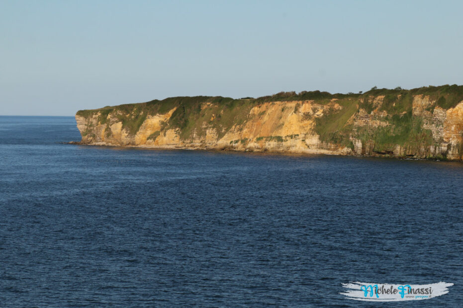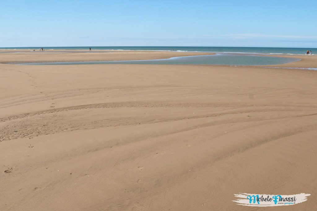 Le dimensioni sono impressionanti: dall’inizio della spiaggia al mare, adesso che siamo in bassa marea, ci sono almeno 5-600 mt di sabbia, inframezzati da qualche laghetto formatosi dal ritiro della marea. Sull’enorme spiaggia non c’è praticamente anima viva, escluse una decina di persone sparpagliate in lontananza. Arriviamo al mare, il Canale della Manica, ma come previsto l’acqua è piuttosto fredda. Restiamo ad ammirare l’impressionante spettacolo naturale offerto dalla spianata di sabbia gialla che contrasta con le scogliere e il verde del grano soprastante. Sconvolge pensare che qui, in questo spettacolo naturale, sia avvenuta una delle stragi umane più cruente del “secolo breve”.